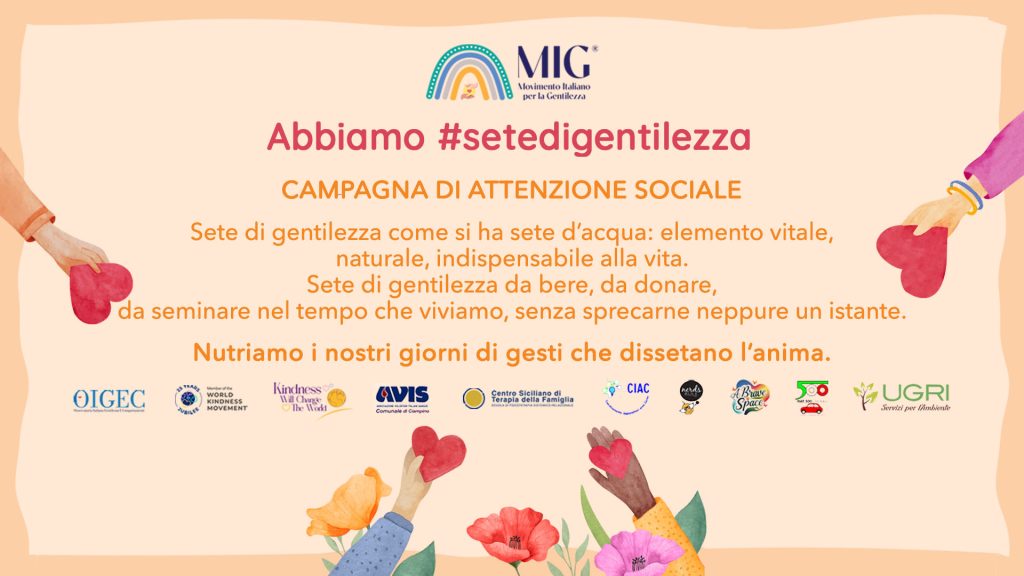 ABBIAMO SETE DI GENTILEZZACampagna di attenzione sociale a cura del Movimento Italiano per la GentilezzaC’è una sete che non si vede, ma si sente.Una sete profonda, sottile, urgente.È la sete di gentilezza.Come l’acqua, la gentilezza è un elemento vitale: naturale, trasparente, indispensabile.Abbiamo sete di gesti semplici e veri, di parole che curano, di sguardi che accolgono.Sete di attenzione, di ascolto, di umanità quotidiana.Viviamo tempi affannati, in cui tutto corre, si consuma, si dimentica.Ma la gentilezza, proprio come l’acqua, ha il potere di nutrire, rigenerare, unire.Una goccia può bastare a cambiare una giornata. Una goccia può diventare sorgente.Con questa campagna, il Movimento Italiano per la Gentilezza lancia un invito semplice e potente:dissetiamo il mondo con la gentilezza.Beviamola, doniamola, seminiamola.Ne basta un sorso, ma che sia sincero.Ne basta un gesto, ma che sia quotidiano.Non sprechiamo neppure un istante.È tempo di nutrire i nostri giorni con tutto ciò che disseta l’anima.Un grazie speciale ai nostri partner permanenti.La nostra gratitudine va a chi, con dedizione e visione, cammina al nostro fianco nel promuovere una cultura di gentilezza, rispetto e responsabilità.Un sentito ringraziamento a UGRI Servizi per l’Ambiente, nostro sponsor principale, per il costante sostegno, la condivisione dei valori e l’impegno concreto nel rendere il mondo un luogo più sostenibile e umano.Grazie alla nostra casa madre internazionale, il WKM World Kindness Movement, che con passione e resilienza diffonde la gentilezza in tutto il mondo. È per noi un onore farne parte in qualità di delegati per l’Italia.Un ringraziamento ai nostri partner operativi negli Stati Uniti: Nerds Rule Inc. e Brave Space, che portano avanti con noi iniziative di impatto e connessione globale.Al nostro partner scientifico, il CSTF – Centro Siciliano di Terapia della Famiglia, riferimento d’eccellenza per il metodo Milan Approach e per l’umanità che accompagna ogni percorso di cura e formazione.Al CIAC – Coordinamento Imprenditori Area Carini (PA), per la sensibilità mostrata verso i nostri principi e per il sostegno imprenditoriale alla gentilezza come valore competitivo.Alla sezione comunale AVIS di Ciampino, nella città metropolitana di Roma, esempio concreto di solidarietà e partecipazione civica.E con grande ammirazione, un grazie speciale al FIAT 500 Club Italia, che con passione e spirito di comunità ci accompagna nel nostro viaggio.