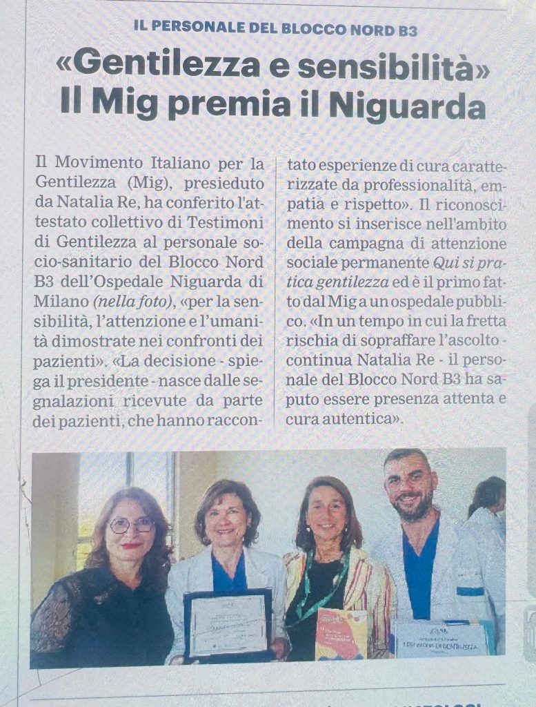 Ma non demorde Natalia. Determinata e con maggior slancio che mai, arriva all’appuntamento e consegna al Niguarda il giusto riconoscimento, nel nome di Luigia, nel nome della gentilezza.